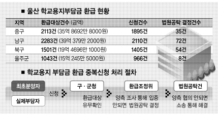 16일 교육과학기술부 등에 따르면 전국의 지방자치단체들은 학교용지부담금 환급 등에 관한 특별법에 따라 지난해 11월1일부터 해당 아파트의 최초 분양자와 입주자 등을 대상으로 신청서를 접수해 환급금을 돌려주고 있다. 울산시는 동구를 제외한 4개 구·군에 6940건(환급금 109억 4013만 6000원)을 대상으로 환급을 해주고 있다.
