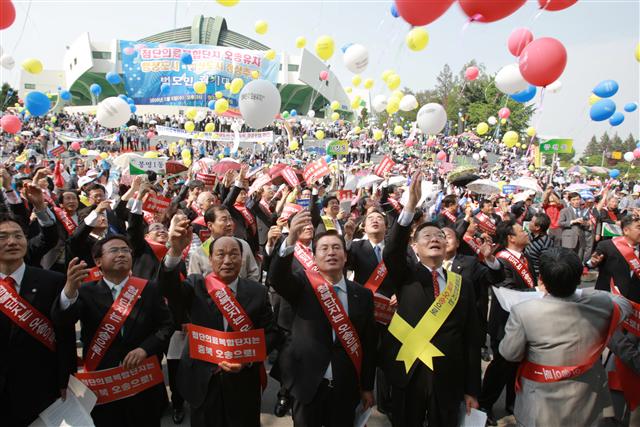 첨단의료복합단지(이하 첨복단지) 유치 등 충북지역 현안 해결을 촉구하는 충북도민 궐기대회가 6일 청주체육관 광장에서 열렸다.| 6일 충북 청주체육관 앞 광장에서 열린 첨단의료복합단지 오송 유치 충북도민궐기대회에서 정우택(왼쪽 네번째) 충북지사 등 참가자들이 정부에 지역현안 해결을 촉구하며 오색풍선을 날리고 있다. 충북도 제공 |