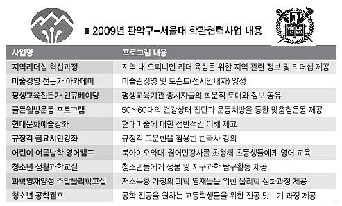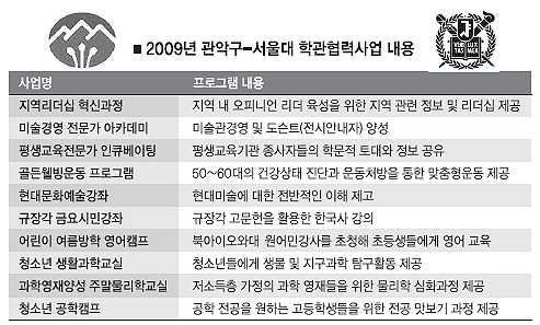 서울 관악구가 서울대와 손잡고 지역사회를 이끌 전문가 육성에 나서고 있다. 서울대라는 우수한 교육인프라를 활용해 리더십, 미술경영, 물리학 영재교육 등 다른 자치구와 차별화된 국내 최고 수준의 커리큘럼을 제공하고 있다. 특히 경제위기로 인한 대량실직으로 어느때보다 ‘평생학습’의 중요성이 커지는 가운데, 신개척 분야인 미술관 관련 산업 전문가를 길러내는 ‘미술경영전문가아카데미’ 등은 양질의 일자리 창출에도 크게 기여한다는 평가다.관악구는 12일 “지역 내 인적자원을 개발하고 평생교육이 특화된 자치구를 만들기 위해 지난 2005년부터 서울대와 함께 ‘학·관 협력사업’을 추진하고 있다.”고 밝혔다. 스포츠, 서예 등 생활밀착형 프로그램을 지원하는 기존 ‘구 문화센터’보다 높은 수준의 교육과정을 원하는 이들을 위해 맞춤형 학습과정을 개설했다. 지역에서 일할 수 있는 전문가를 육성하기 위해서다.