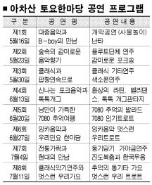 16일 세종대 풍물패 ‘터벌림’의 사물놀이가 토요한마당의 개막을 알리는 무대를 연출한다. 이어 비보이 퍼포먼스와 난타, 트로트, 발라드 공연이 각각 펼쳐진다. 23일엔 ‘숲속의 감미로운 음악향기’라는 주제에 맞춰 플루트 연주, 감미로운 포크송, 인기 발라드 가요, 레크리에이션 등이 선을 보인다.