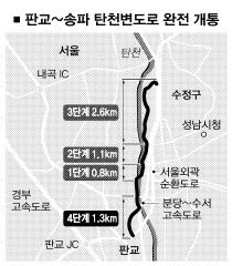 이어 올해 판교지구~탄천로 시점인 1.3㎞ 구간을 개통해 동판교에서 기성 시가지를 거치지 않고 서울 송파로 바로 연결되는 도심 우회도로를 확보했다.