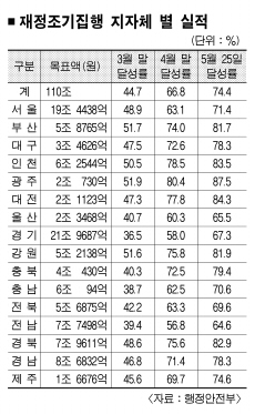 각 지자체의 재정조기집행 목표 달성률은 지난 3월 말 44.7%에서 4월 말 66.8%로 22.1%나 상승했다. 하지만 5월 들어 달성률이 큰 폭으로 하락했다. 이 같은 추세라면 당초 목표치 110조원을 상반기에 모두 집행하는 것은 불가능할 것으로 예상된다.