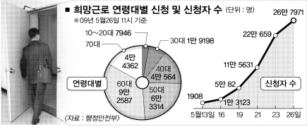 실직자 등 저소득층에게 6개월간 일자리를 제공하는 희망근로 프로젝트사업 신청자 수가 목표치인 25만명을 훌쩍 뛰어넘어 27만명에 육박하고 있다. 하지만 절반 이상이 60~70대 고령자인 데다 30대 이하 청년실업자 지원율은 10%에 불과해 도입 취지가 퇴색했다는 지적이다.●목표치 25만명 넘어 27만명 육박