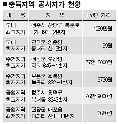 공업지역은 청주시 흥덕구 복대동 3343이 1㎡당 46만 9000원으로 최고지가를, 단양군 매포읍 하괴리 산 1의 13이 3680원으로 최저지가를 나타냈다.