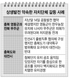 공동발전을 위해 손을 잡은 자치단체들이 마찰을 빚는 사례는 이뿐만이 아니다. 충청권 3개 광역단체는 민선 4기 출범 직후 단체장들이 만나 협의체를 구성했지만 양보보다는 자기밥그릇 챙기기에 바쁜 모습이다. 충북은 각종 혜택을 공유하자며 대덕특구 범위 확대를 요구하지만 대전은 반대하는 등 이견을 보이고 있다.