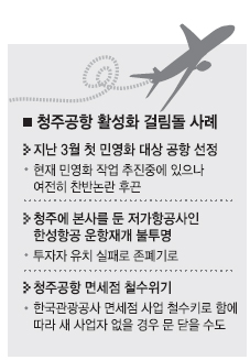 충북도 관계자는 “지난해 10월부터 운항을 중단한 한성항공이 투자자 유치에 실패하면서 운항 재개가 어려운 상황”이라며 “조만간 운항 재개를 하지 못하면 국토해양부가 사업 일부정지 처분을 내릴 가능성이 크다.”고 말했다. 한성항공은 그동안 청주~제주노선을 운영해 왔고, 올해에는 국제노선 운항을 시작할 계획이었다. 청주공항 면세점도 폐쇄될 위기에 처했다. 공기업 선진화 방안의 하나로 면세점 사업에서 손을 떼기로 한 한국관광공사는 직영으로 운영 중인 청주공항 면세점을 오는 10월까지만 문을 열 계획이다.