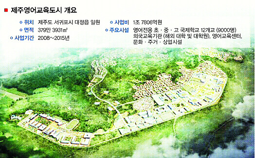 380만㎡여 규모의 제주영어교육도시는 2015년까지 1조 7806억원을 투자, 12개의 초·중·고 국제학교를 비롯해 외국교육기관과 영어교육센터 등이 들어선다. 또 주택 5800여채를 건설해 9000여명의 학생과 학부모 등 2만 3000명을 수용하게 된다. 2011년 3월에 공립 1개교와 사립 2개교 등 국제학교 3곳이 먼저 문을 연다.