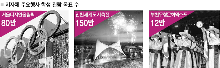 25일 전국 지자체들에 따르면 서울시는 2010년 세계 디자인수도 선정을 기념하기 위해 잠실종합운동장 등에서 여는 서울디자인올림픽(10월9~29일)의 관람객 유치 목표를 지난해(200만명)보다 30% 이상 늘린 300만명으로 잡았다. 이중 초·중·고 관람객은 80만명으로, 서울과 수도권 지역에서 각각 30만명 이상이 행사장을 찾을 것으로 시는 예상한다. 시는 300만명 관람 여부는 학생 유치에서 결정된다고 보고 일선 부서들이 이에 적극적으로 나설 것을 당부하고 있다.