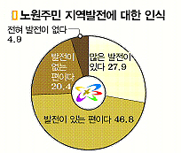 ‘노원구가 뜨고 있다?’노원구 주민 10명 중 8명이 최근 3년간의 지역 발전을 몸으로 체감한다고 대답한 것으로 나타났다. 주민들은 특히 지역개발(32.3%)과 교육·문화(30.3%), 주거환경(28.8%) 등에서 높은 만족도를 보였다. 노원구는 지난 6월27~29일 3일간 여론조사 전문기관인 ‘더 피플’에 의뢰해 주민 1000명을 대상으로 실시한 자동응답전화(ARS) 여론조사에서 응답자의 74.7%가 3년 전보다 많이 발전했다고 한 것으로 조사됐다고 13일 밝혔다.