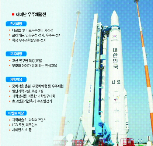 이어 오전 11시에는 고산 한국항공우주연구원 소속 연구원의 ‘우주연구원의 과학길라잡이 특강’이 이어져 우주와 과학에 관심있는 학생들에게 꿈과 희망의 메시지를 전달한다. 특히 오는 30일 나로호(대한민국 최초 우주발사체)의 성공적 발사를 기원하는 ‘나로호 및 나로우주센터 특별전’도 열려 더욱 의미있는 교육축제가 될 것이다. 체험전은 전시마당, 체험마당, 교육마당, 이벤트 마당으로 구성해 자칫 딱딱해지기 쉬운 교육과 과학을 흥미와 재미로 풀어내게 된다.