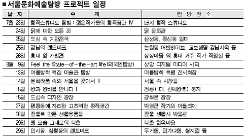 주요 탐방 대상지로는 난지 창작스튜디오(23일), 닭 문화관(24일), 홍대 거주 작가 작업실(26일), 정릉(8월15일) 등이 있다. 25일과 다음달 29일에는 가족이 참여하는 ‘우리동네 문화탐방’을 열어 삼선동·창신동 일대와 북촌 한옥마을을 둘러본다. 참가비는 없으며, 일정과 신청은 홈페이지(www.sfac.or.kr)에서 확인할 수 있다.