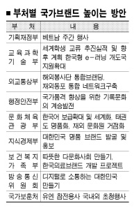 이 대통령은 이날 국가브랜드위 및 9개 부처로부터 지난 3개월간의 성과를 점검하는 자리에서 진척이 있는 현안에 대해선 격려했지만, 지지부진한 현안에는 크게 질책한 것으로 알려졌다. 국가브랜드를 높이는 것은 국가경쟁력 강화의 직결요소이자 경제살리기의 바탕이라는 신념이 반영됐다.