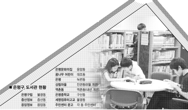 이후 2001년 10월 첫 은평구립도서관 개관을 시작으로 지난해 한글날에는 ‘증산정보도서관’이 문을 열어 은평구는 3개의 구립도서관을 갖게 됐다. 여기에 구청 별관1층 전관을 1만여권의 교양도서를 갖춘 ‘도서사랑방’으로 꾸몄고 동 주민센터에도 ‘작은문고’를 마련했다.