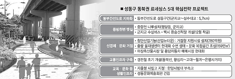 성동구는 아름다운 수변도시로 만들기 위해 주거와 문화, 첨단 산업이 어우러진 도시로 발전하기 위한 ‘동북권 르네상스 5대 핵심전략 프로젝트’를 발표하고 2014년까지 단계적으로 사업을 진행한다고 27일 밝혔다.
