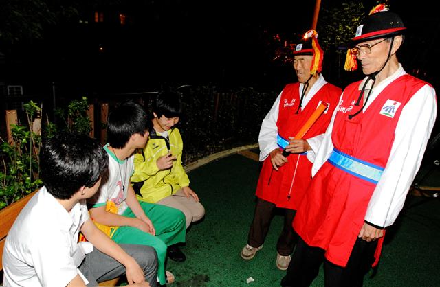 30일 오후 9시 주황색 나트륨 가로등이 어둠을 밝히는 강서구 화곡동 한 아파트 단지. ‘딱, 딱, 딱~.’ 막대 부딪치는 소리와 함께 멀리서 조선시대 포졸 모습이 나타났다. 검은 색칠을 한 패랭이(챙 넓은 포졸 모자)에 하얀 저고리를 입고, 붉은 두루마기 위에 야광 허리띠를 맸다. 손에는 번쩍번쩍 불이 들어오는 경광봉(警光棒)을 들고 목에는 은색 호루라기를 걸었다.