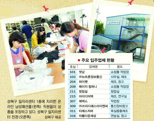 “하루하루 웃으며 신바람나게 일할 수 있게 해준 관계자들께 감사드립니다.” 3일 성북구 홈페이지의 ‘칭찬합시다’코너. 이 코너에는 최근 성북구 일자리센터 입주자들의 글이 잇따라 올라오고 있다. 센터에 입주한 뒤 싼값에 부담없이 사업을 번창시키고 있다는 감사의 글들이다. 센터는 지난 5월 말 지상 3층, 7323㎡ 규모로 개장했다.32개 업체가 입주한 만큼 사연도 가지가지다. 1층에 자리한 온라인 쇼핑몰 ‘멋남’의 도진우 부장은 “이전 사무실에 비해 3배나 넓은 사무실을 사용하는데 비용은 오히려 5분의1 밑으로 떨어졌다.”며 “덕분에 성북구에 사는 직원 3명을 새로 뽑았고, 회사는 남성토털패션 쇼핑몰 1위로 올라섰다.”고 자랑했다.