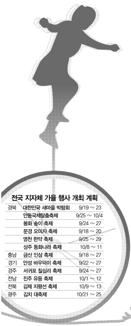 경북 안동시도 다음달 25일부터 10월4일까지 열흘간 안동 낙동강변 탈춤공원과 하회마을 등에서 ‘안동 국제 탈춤 페스티벌’ 행사를 개최한다. 행사 예산은 19억원. 경북 봉화군도 4억원을 들여 다음달 24일부터 27일까지 4일간 봉화 체육공원 등지에서 ‘봉화 송이축제’를 연다. 이밖에 경북도내에서 9~10월 예정된 주요 축제는 20개가 넘는다. 여기에 각종 체육대회 및 문화·예술 행사까지 감안하면 100여개가 넘을 것으로 추산된다. 이런 실정은 전국적으로 비슷한 것으로 알려졌다.