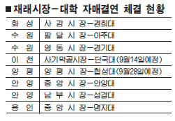 경기도와 도내 대학들이 재래시장 살리기에 나섰다. 대학들은 대형마트와의 경쟁으로 어려움을 겪고 있는 재래시장과 자매결연을 통해 참신한 아이디어를 제공하며 시장에 활력을 불어넣고 있다.20일 도에 따르면 도의 ‘재래시장 살리기 프로젝트’의 일환으로 21일 수원 영동·팔달시장과 경기대·아주대가 각각 1시장 1대학 자매결연 협약을 체결한다.경기대와 아주대는 이들 시장의 경영개선을 위한 자문과 상담 지도 활동을 비롯해 마케팅, 시장·점포 디자인, 관광객 유치 등을 위한 컨설팅을 지원한다. 특히 팔달시장은 화성과 연계한 전통 문화거리를 조성하고 영동시장은 전통한복 특화공간을 조성할 계획이다. 이에 앞서 안양 중앙시장과 안앙대, 안양 남부시장과 성결대, 용인 중앙시장과 명지대, 화성 사강시장과 경희대 등 4개 시장 및 대학이 손을 잡았다.