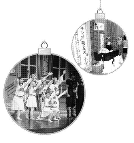 | 서울 중랑구민회관 로비에 구민들이 공연장 입장료 대신에 낸 쌀과 라면 등이 차곡차곡 쌓여 있다(위). 뮤지컬 ‘사운드 오브 뮤직’ 공연에서 구민들로 구성된 배우들이 열연하고 있다.중랑구 제공 |