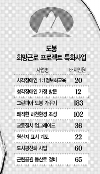 도봉구는 지역 특성에 맞는 일자리를 많이 만들었다. ▲초안산·쌍문·월천 어린이공원 등을 정비해 쾌적한 휴게공간 및 녹색환경을 구현한 ‘그린피아 도봉 가꾸기 사업’ ▲중고 컴퓨터를 수거해 희망근로 정보기술(IT)봉사단의 정비를 거쳐 노인 및 장애인 등에 보급한 ‘그린도봉 IT희망나눔세상’ ▲ 버려지는 소형가전제품을 수거해 금·은·팔라듐 등 희귀자원을 추출하는 ‘도시광산화사업’ ▲시각장애인 3인1조로 장애인시설 및 경로당을 방문해 봉사하는 ‘시각장애인 안마봉사단’ 등 다양한 사업들이 심사위원들의 눈길을 끌었다.
