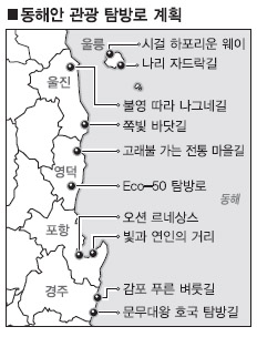 이를 위해 도는 포항 등 동해안 5개 시·군의 명품 관광 탐방로가 될 블루로드 10곳(125.8㎞)을 선정, 조기 개발해 우리나라 최고의 녹색관광 휴양거점으로 발돋움시킨다는 것이다. 블루로드 10선은 ▲포항시 ‘오션 르네상스’ 및 ‘빛과 연인의 거리’ ▲경주시 ‘문무대왕 호국 탐방길’ 및 ‘감포 푸른 벼룻길’ ▲영덕군 ‘Eco-50 탐방로’와 ‘고래불 가는 전통 마을길’ ▲울진군 ‘쪽빛 바닷길’ 및 ‘불영 따라 나그네길’ ▲울릉군 ‘시걸 하포리운 웨이’와 ‘나리 자드락길’ 등이다.
