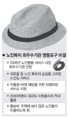 1일 영등포구에 따르면 구 노인종합복지관 부설 ‘독거노인 원스톱지원센터’(이하 지원센터)는 지난달 보건복지가족부가 주최한 ‘노인돌봄 기본서비스사업 우수운영사례’ 공모에서 108개 전국 노인복지시설 가운데 대도시 부문에서 최우수 기관으로 선정됐다. 홀몸노인 보호를 위한 사업을 효율적으로 운영하고, 민간 자원봉사자를 적극적으로 활용하는 점이 높은 평가를 받은 덕분이다.