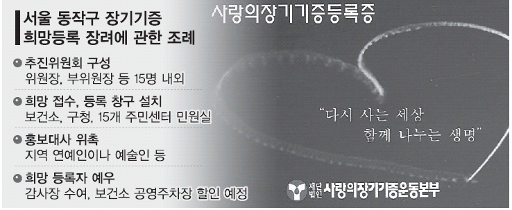 구의회가 고 김수환 추기경의 각막기증을 계기로 들불처럼 번지고 있는 장기기증운동을 동작지역에 뿌리내릴 수 있도록 조례이 제정에 나서는 것이다.