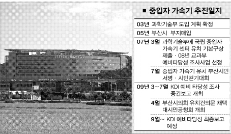 부산시가 2003년부터 공을 들여온 ‘중입자가속기’ 건설에 대한 건설타당성 연구용역 최종결론을 앞두고, 촉각을 곤두세우고 있다.한국개발연구원(KDI)이 지난 4월 발표한 타당성 중간보고에서 낮은 평가를 내놓자, 정부도 거액의 예산지원에 난색을 표명하며 한발 물러선 것으로 알려졌기 때문이다. 건설이 무산되면 부산시는 미리 받은 30억원의 선행연구비를 고스란히 반납하고 내년 지방선거를 앞두고 주민들의 반발을 감수해야 할 처지에 몰린다.