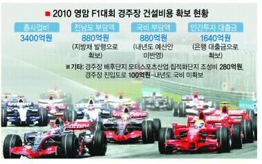 당초 자동차 경주장 건설비용은 3400억원으로 이 중 정부와 전남도가 880억원씩 1760억원을 부담하고 나머지 1640억원은 민자(대출금)로 충당키로 분담안이 확정됐다. 이에 따라 전남도는 사전검사를 받으려면 내년 6월까지 경주장 건설공사를 마쳐야 하기 때문에 열악한 재정형편에도 지방채 880억원을 발행했다. 또 민간자본인 금융권 대출로 1980억원(첫 대회 개최권료 340억원 포함)을 확보했다. 현재 경주장 종합공정률은 55%선이다. 하지만 국비 미확보로 공사가 지연되는 등 만일의 사태가 발생할 경우 내년 10월 코리아 그랑프리 자체가 F1대회 순회 경기일정에서 제외되는 상황이 올 수도 있다는 우려가 일고 있다.