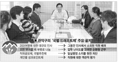 사실 관악구가 프로 선수단의 선수 선발 시스템까지 벤치마킹해 가며 정기인사를 단행한 데는 그동안 인사비리로 얼룩진 자치구의 구태를 척결하겠다는 뼈를 깎는 각오가 담겨 있다.
