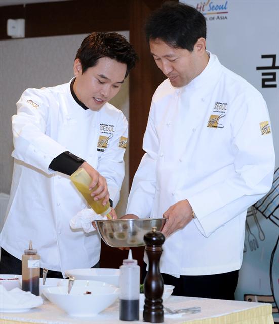 권씨는 이날 위촉식에서 오세훈(오른쪽) 서울시장에게서 시 홍보 슬로건이 새겨진 셰프복을 받았다. 그는 9~11일 호주 시드니국제음식페스티벌 초청 쇼케이스에 서울시 홍보를 위해 이 셰프복을 입고 참석한다. 또 자신이 직접 출연해 서울의 매력적인 모습과 우수한 음식문화를 담은 홍보용 미니다큐멘터리도 만들 예정이다. 특히 그는 서울의 맛을 알릴 수 있는 요리인 ‘테이스트 오브 서울(Taste of Seoul)’을 정기적으로 개발해 서울 한남동 자신의 레스토랑에서 선보이기로 했다. 위촉식 직후 권씨는 오 시장과 함께 복분자 소스에 김치와 건포도를 얹은 쇠고기 요리를 만들어 시식행사도 했다.
