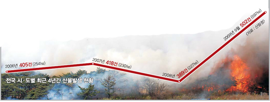 8일 경북도 등에 따르면 올 1월부터 5월15일까지 경북지역에서 발생한 산불은 117건으로 2007년 같은 기간 53건, 2008년 44건보다 최대 3배 가까이 증가했다. 피해 면적도 268㏊로 2007년 60㏊, 2008년 17㏊보다 많게는 16배나 늘었다. 산불 진화에 동원된 해당 지자체 공무원과 산불 진화요원, 주민, 군인 등도 예년의 1만~2만명에 비해 3만 9000여명으로 급증했다.