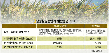 고성군은 올해 29곳, 370㏊의 농경지에 생명환경농법으로 벼를 재배했다. 첫 해인 지난해 163㏊보다 2배 넘게 면적이 확대됐다. 지난해 수확결과를 본 농민들이 많이 참여했기 때문이다. 14일 대천면에서 올해 생명환경농법 벼의 첫 수확이 있다. 지난해 수확결과 생명환경농법으로 재배한 벼는 10a당 평균 생산량이 504㎏으로 일반농법 수확량 473㎏보다 많았다. 고성군 농업기술센터측은 올해 수확량도 지난해와 비슷할 것으로 예상했다.