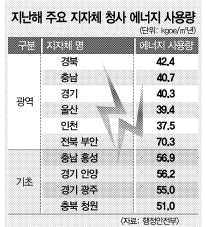 상당수 지방자치단체가 청사(廳舍)의 에너지 사용 절감에 무관심해 정부가 대책을 마련 중인 가운데<서울신문 10월23일자 25면>, 경북도와 전북 부안군 등이 지난해 청사 면적에 비해 에너지를 많이 사용한 것으로 나타났다.29일 행정안전부가 일부 공개한 ‘지자체 청사 에너지 사용실태 현황’에 따르면, 경북도는 지난해 청사 1㎡당 42.4kgoe(석유 1㎏을 연소할 때 나오는 에너지)를 사용해 16개 광역 지자체 가운데 가장 높았다. 충남도(40.7kgoe)와 경기도(40.3kgoe), 울산시(39.4kgoe) 등도 전체 지자체 평균(31.8kgoe)을 웃돌았다. 기초 지자체별로는 전북 부안군이 70.3kgoe로 가장 많은 에너지를 소비했으며, 다음으로 충남 홍성군(56.9kgoe)과 경기 안양시(56.2kgoe) 등의 순이었다.
