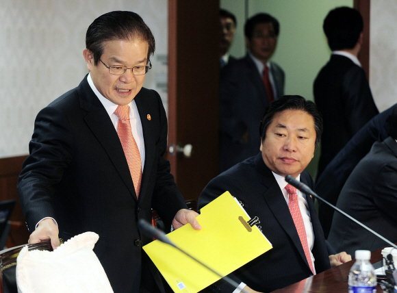 정부의 세종시 수정안은 행정도시 대신 기업도시에 과학비즈니스벨트와 경제자유구역을 더하는 방향으로 추진되고 있다.| 세종시 정부지원협의회 회의 권태신 국무총리실장이 13일 서울 정부중앙청사에서 열린 ‘세종시 정부지원협의회’에서 참석자들에게 관련 자료를 설명하고 있다. 손형준기자 boltagoo@seoul.co.kr |