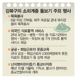 강북구가 겨울 한파를 녹이는 소외계층 보듬기로 주목받고 있다. 17일 강북구에 따르면 6급 이상 간부 공무원들이 참여하는 목욕봉사와 관내 의료기관에서 제공되는 외국인근로자 대상 통역서비스, 공공·희망근로자를 위한 웃음치료까지 다양한 활동들이 꽃을 피우고 있다. 난치병 어린이를 위해 3개 종교단체가 벌여온 연합바자회도 올해로 10회째를 맞았다.