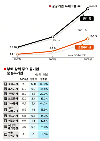 지난해 국가채무 전체 309조원과 비교하면 69% 수준으로 2007년의 국가채무 대비 57%와 비교할 때 1년 새 12%포인트나 상승했다. 최대 공기업인 한국토지주택공사(LH)는 보금자리 주택사업, 수도권 택지지구사업 등 국책사업을 떠안아 올해 부채가 107조원에 이를 것으로 예상된다. 김성식 한나라당 의원은 최근 10개 주요 공기업 자료를 통해 이명박 정부 집권 5년간 연평균 36조원씩 모두 181조원이 증가할 것으로 전망했다.