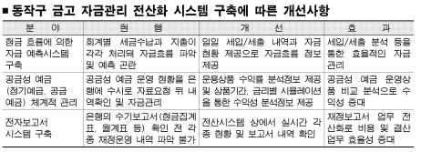 행정서비스의 효율을 높이기 위한 각종 전산화작업에 나서고 있는 서울 동작구가 자치구 처음으로 구의 자금관리 시스템 구축에 성공해 화제다. 동작구는 지난 23일 인터넷이나 전산망으로 실시간 구 금고 자금흐름을 파악할 수 있는 ‘자금관리 전산처리 시스템’을 개발, 30일부터 본격적인 운영에 들어간다고 이날 밝혔다. 이는 구 자금이 들어오고 나가는 643개 은행 계좌를 한 번에 관리할 수 있는 새로운 통합 시스템이다.김우중 구청장은 “이번 자금관리 시스템 가동으로 금전사고 예방뿐 아니라 이자수익 향상 등 공금예금의 수익성 증대에도 크게 도움이 될 것”이라면서 “21세기에 걸맞은 첨단 행정시스템 개발로 인력낭비는 물론 예산절감에 앞장서겠다.”고 말했다.
