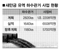 2001년 확정된 정부의 새만금 수질개선대책 세부 실천계획에 따라 설치돼야 할 새만금 유역 하수관거는 2820㎞에 이른다. 2011년까지 투입될 예정인 총사업비는 1조 2208억원다. 하지만 올해까지 추진된 하수관거 사업은 58.2%인 1640㎞에 지나지 않는다.