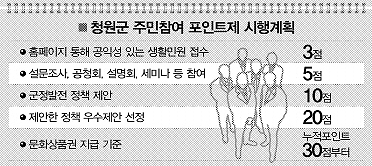 충북 청원군은 군민들이 적극적으로 군정에 동참하도록 하기 위해 도내에서 처음으로 내년부터 ‘주민참여 포인트제’를 운영한다고 21일 밝혔다.