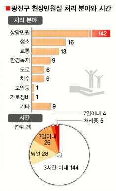 민원해결 실적도 눈부시다. 구는 9~11월 3개월 사이 203건의 불편사항을 접수, 이중 198건을 해결했다. 처리율만 97.5%에 이른다. 처리기간별 비율을 살펴보면 3시간 안 71%, 3시간 이상~하루 14%, 7일 안 2%로 나타났다. 당일 처리비율만 85%. 그만큼 신속하다는 의미다.