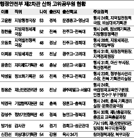 지방행정·지방재정세제·지역발전정책국장 등 세 자리는 고위공무원 나등급(2급)이지만 ‘1.5급’ 정도의 고참 국장이다. 차관보가 지방 업무를 총괄하지만 이들은 실·국장회의에 참석할 만큼 업무비중이 높다.