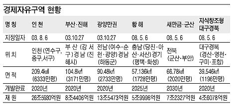경제자유구역은 2003년 1차로 인천, 부산·진해, 광양만에 이어 2008년에 황해, 대구·경북, 새만금·군산 등이 지정되었다.