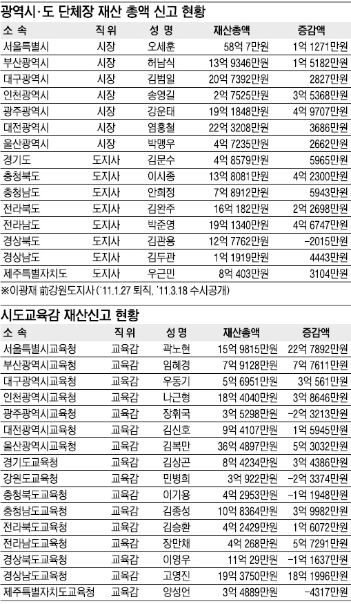 광역단체장 가운데 지난해 재산이 가장 많이 증가한 사람은 강운태 광주시장으로 4억 9700만원이 늘었다. 선거보전 비용과 급여 저축에 따른 결과라고 강 시장은 설명했다. 박준영 전남도지사의 경우 부동산 가격 상승, 자녀 급여 등으로 재산이 4억 6700만원 늘어나 두번째로 증가폭이 컸다.