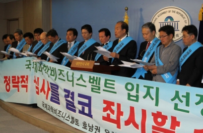 | 호남권 반발 김영진(오른쪽 네 번째) 민주당 의원, 강운태(다섯 번째) 광주시장 등 호남권 인사들이 15일 국회 정론관에서 기자회견을 열고 국제과학비즈니스벨트 입지 결정을 수용할 수 없다는 입장을 밝히고 있다. 연합뉴스 |