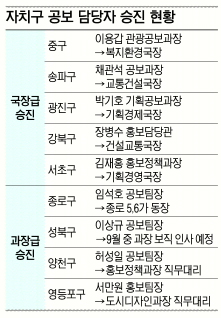 국장으로 승진한 채관석(57) 송파구 전 공보과장과 장병수(57) 강북구 전 홍보담당관, 박기호(55) 광진구 전 기획공보과장, 김재홍(58) 서초구 전 홍보정책과장, 이용갑(57) 중구 전 관광공보과장 등은 공보 분야의 베테랑들이다.