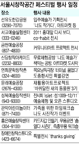 서울시는 오는 30일부터 다음 달 3일까지 서교예술실험센터, 금천예술공장, 연희문학창작촌 등 창작공간 9곳과 선유도 한강공원에서 ‘창작공간 축제’를 연다고 26일 밝혔다. 창작공간 입주 예술가를 비롯해 관련 예술가 300여명이 참여하는 전시, 체험, 아트마켓, 공연, 투어 등 50여개 프로그램으로 진행된다. 5개의 테마로 조성된 특별 부스 15개를 중심으로 한 전시와 체험 행사는 무료다. 단 창작공간 투어는 홈페이지(www.seoulartspace.or.kr)에서 예약해야 한다.