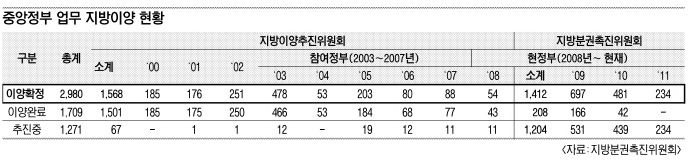 참여정부(2003~2007년)와 비교했을 때 이양 사무는 현 정부가 월등히 많다. 참여정부 때 이양을 확정한 사무는 902개로, 이중 848개 업무가 이양 완료됐다. 현 정부 들어 이관 업무 건수가 많은 것은 ‘지방분권 확대’를 주요 국정과제로 추진했기 때문이다.