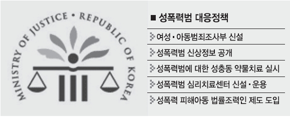 이 때문에 성폭력 범죄 대응이 법무부의 현안이었다. 일부의 반발에도 올해 인터넷 성범죄자 신상공개 시스템(아동 대상 성범죄자 알림e제도), 화학적 거세로 불리는 ‘성충동 약물치료제도’ 같은 성범죄 재발방지 대책을 전격적으로 시행했다. 앞서 2009년 시작된 전자발찌(성범죄자에 대한 전자장치 부착)제도와 2010년 시행된 ‘범죄자 DNA 신원확인 정보 이용 및 보호법’까지 포함하면 대응 체계상으로는 적어도 세계적인 수준의 성범죄 방지 체계를 마련했다고 해도 과언이 아니다. 또 조만간 성폭력사범을 대상으로 한 심리치료센터도 개설될 예정이다.