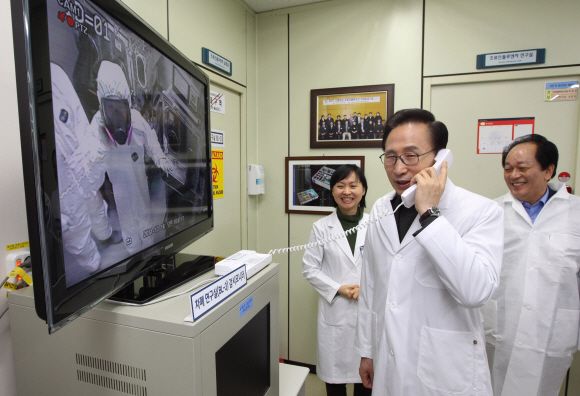 한·미 자유무역협정(FTA)으로 인한 농어업 피해를 보전하기 위해 농어업 시설 현대화에 향후 10년간 10조원이 투입된다. 내년에 농식품 수출 100억 달러를 달성하고 농협 개혁을 통해 농산품 판로 확대와 물가 안정이 유도된다. 불법으로 우리 영해를 침범하는 중국 어선 등 중대 위반 어선에 대해서는 3년간 입어 자격이 취소된다.| AI 연구원들 격려 이명박 대통령이 16일 오전 경기 안양시 농림수산검역검사본부 회의실에서 열린 농림수산식품부의 업무 보고를 받은 후 조류인플루엔자 연구실을 방문해 격리실에서 연구하는 연구원들에게 화상전화로 격려하고 있다. 김명국기자 daunso@seoul.co.kr |